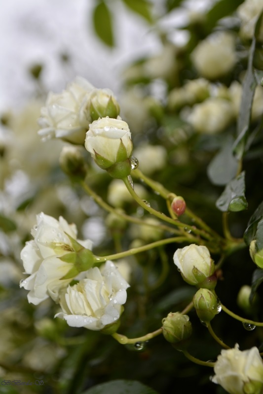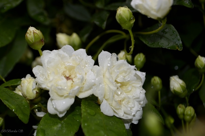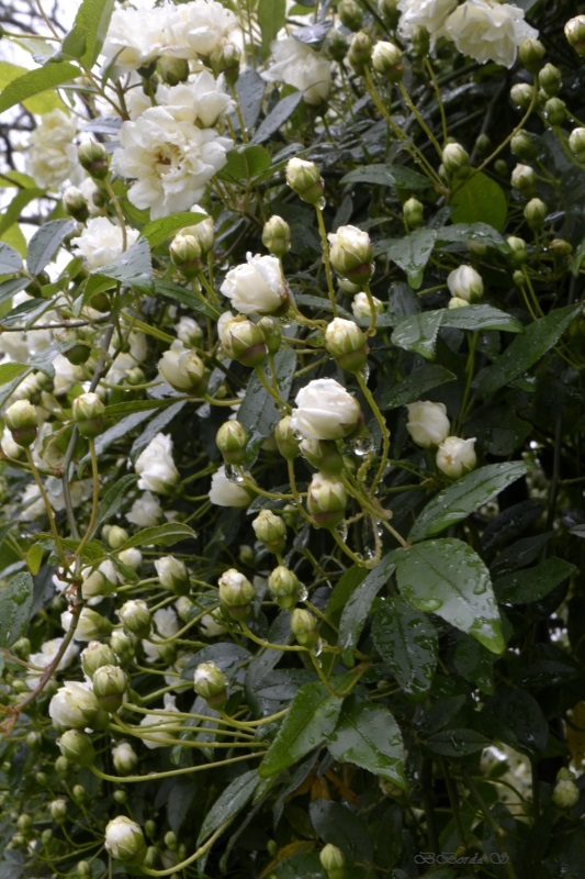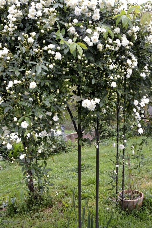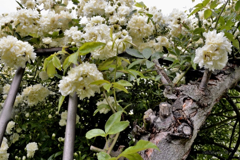 Le rosier liane aux milliers de petites roses crème a bien supporté son coup de tornade de l’an dernier et, sans rancune malgré sa coupe drastique, nous offre un somptueux ruissellement de fleurs blanches.