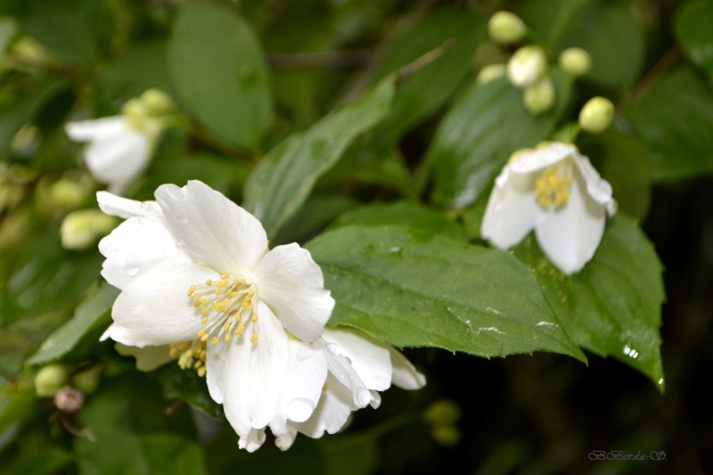 Puis avant de descendre dans le champ, visite au seringat de Germaine, quelques fleurs et beaucoup de boutons. Mais on en sent déjà le parfum… j’avais envie d’un bouquet, c’est trop tôt !