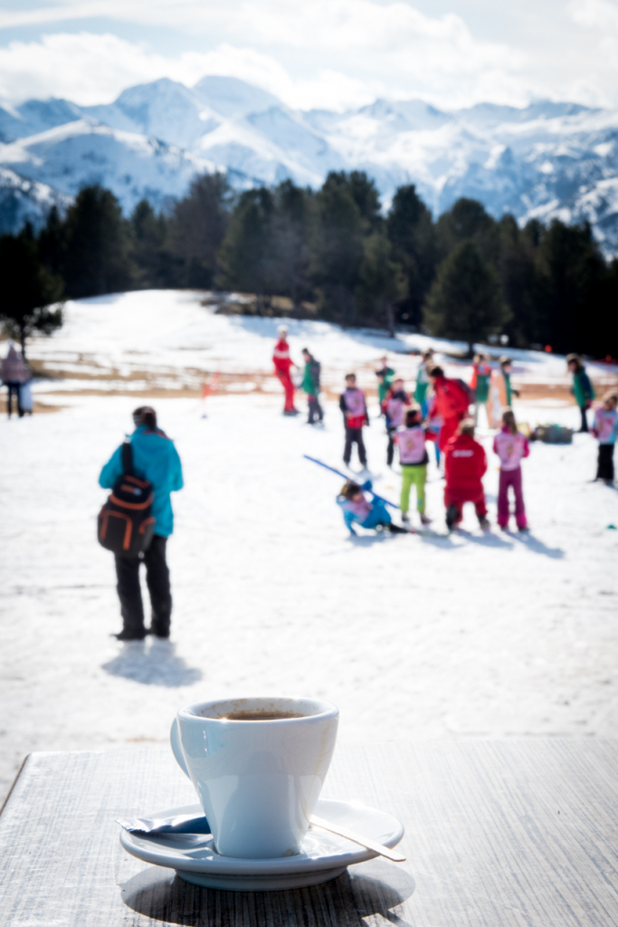 Pendant ce temps, Guillemette et moi allons prendre un café, avec vue imprenable sur les Pyrénées. Et les skieurs et lugeurs, parce que oui, il y en avait (encore une photo de Guillemette, la mienne était complètement ratée).