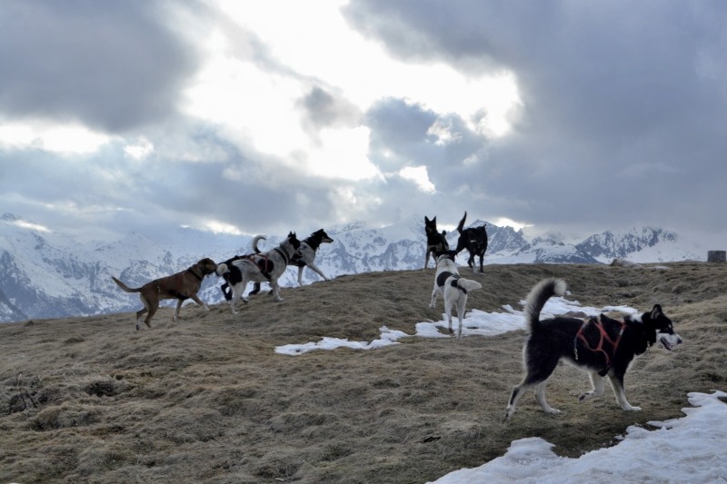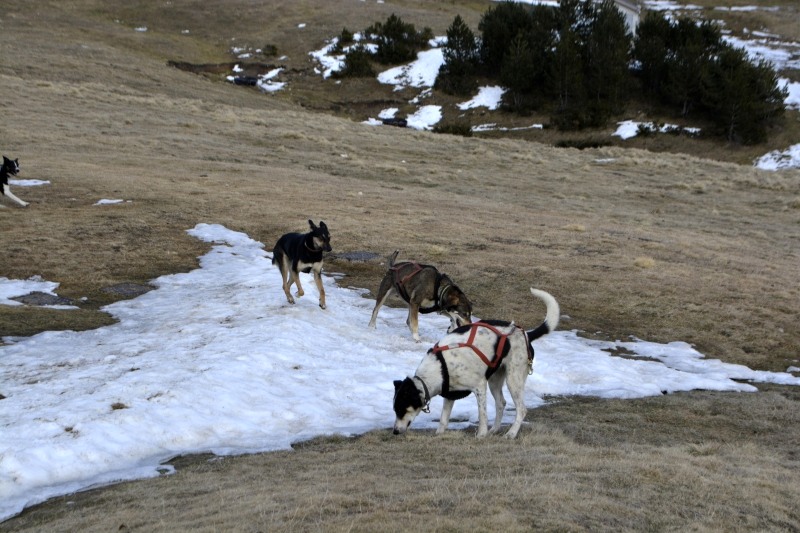 Normalement, en hiver (Scandinavie oblige 😉 ), vous pouvez faire des balades en traineau tiré par des chiens… mais là… les traineaux s’étaient transformés en chars à roues ! Nous sommes redescendues vers la cabane d’accueil des balades en traineau, un attelage venait d’arriver, et les chiens dételés couraient partout, se roulaient dans les plaques de neige…