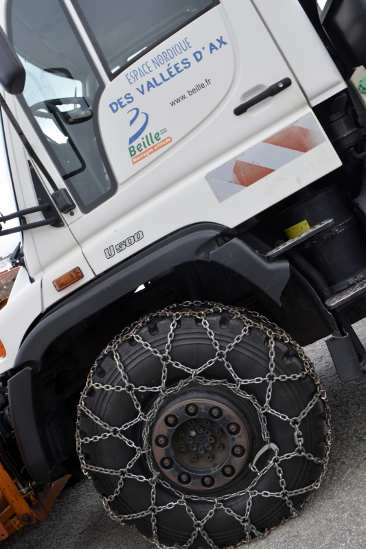 Retour vers la voiture, le soleil éclairait encore le versant de la vallée d’Ax. Les bonhommes de neige qui nous avaient accueillies le matin étaient toujours là… (et ceux des filles restaient bien cachés derrière les petits sapins). Sur le parking, le camion de la station espérait pouvoir encore se servir des chaînes…