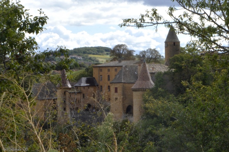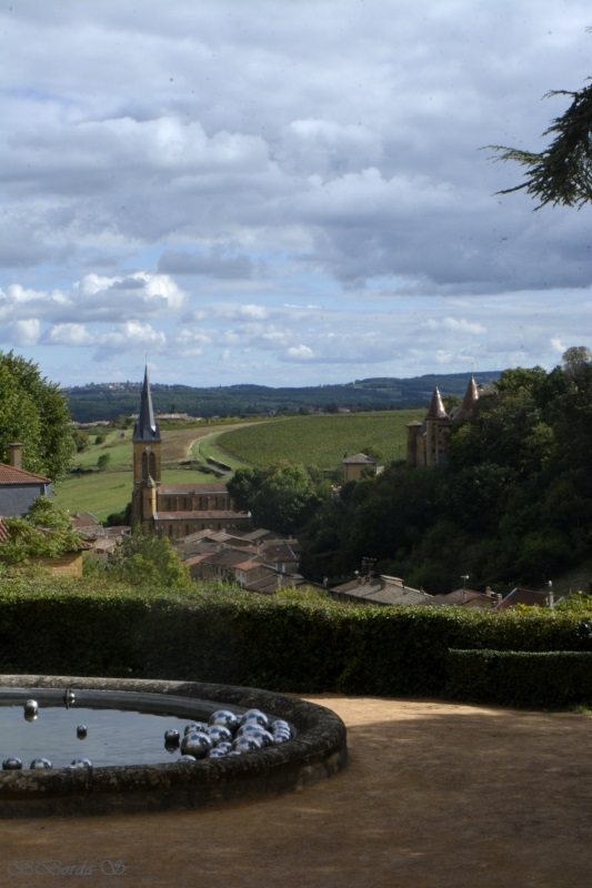Situé dans le département du Rhône, dans la partie des « Pierres Dorées », le village de Jarnioux ne se contente pas d’un simple manoir, mais comporte, sur la colline en face, un château, ancien château-fort fondé à la fin du XIIIe siècle ou au début du XIVe siècle, profondément remanié du XVe au XVIIe siècle, et entre les deux un ancien réseau de chemin de fer secondaire (1898-1934) à voie métrique, constitué de deux lignes, dont le tracé se situe intégralement dans le département du Rhône (une de ces fameuses et nombreuses lignes qui maillaient notre pays il y a longtemps). J’ai un peu raté la photo de cette voie ferrée, devenue voie verte, mais de la terrasse du manoir on avait une belle vue sur le château de Jarnioux.