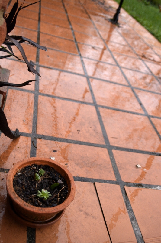 En tout cas, j’aime bien regarder, à travers les gouttes sur les vitres, ce ciel gris, le jardin si vert (et pour cause… merci la pluie !), la terrasse qui attend le retour de l’été et des soirées amicales.