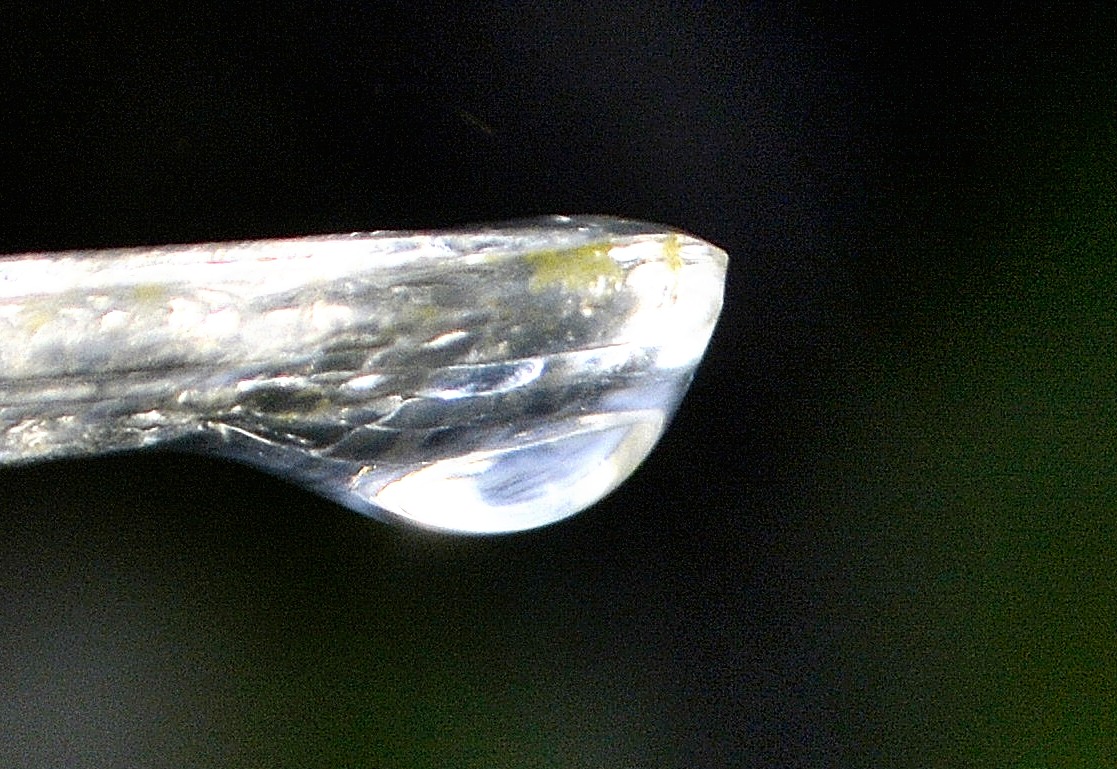 Quand il pleut, j’essaie souvent de photographier ces gouttelettes en suspens, jouant un peu les stars, se faisant attendre pour rejoindre leurs copines sur l’herbe ou la terrasse… mais ce n’est pas facile, et je n’ai encore jamais réussi à en photographier une au moment où elle se décidait !