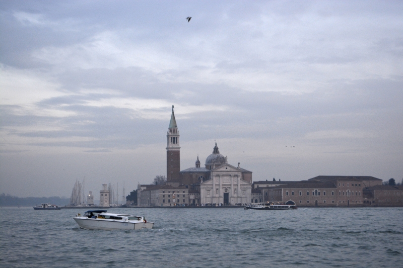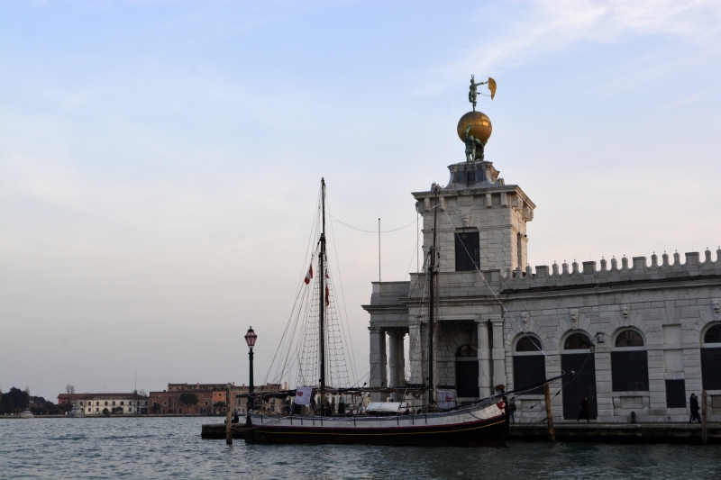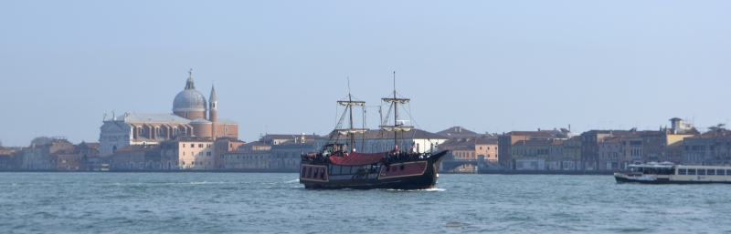 J’aime bien aller à la pointe de la Dogana, qui marque les limites du Grand Canal et de celui de la Giudecca, et où la lagune s’offre à la vue. Canal de la Giudecca sur lequel navigue parfois un bateau « pirate » pour touristes… et, heureusement un peu moins m’a-t-il semblé, quelques monstres croisiéristes.