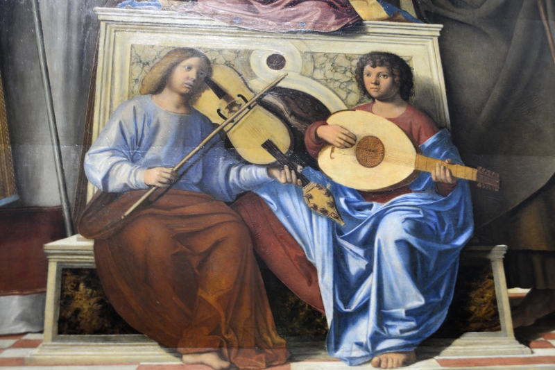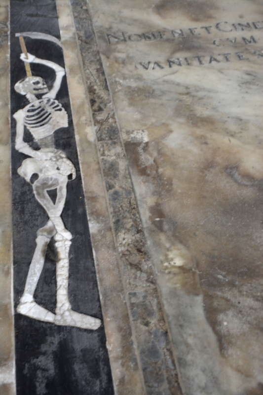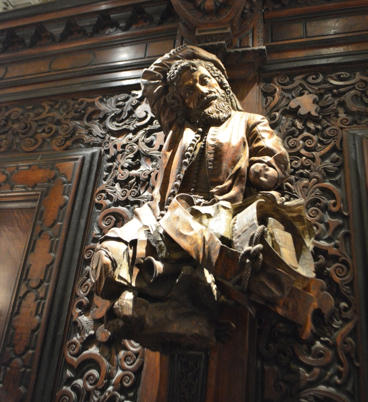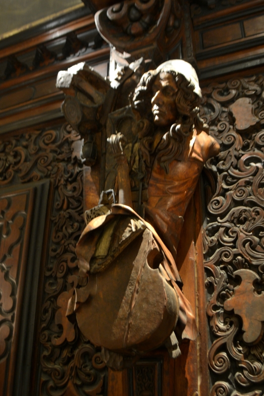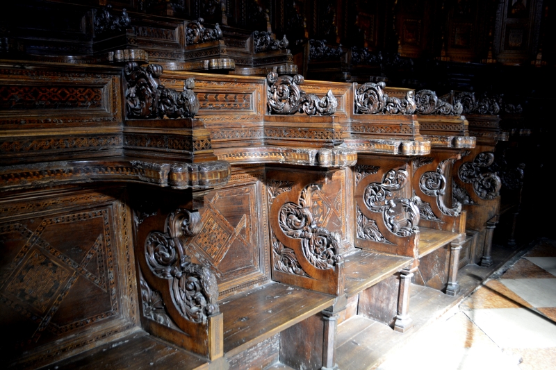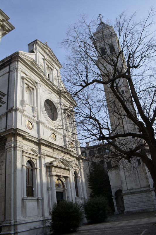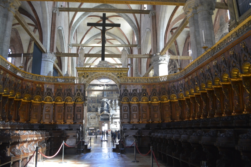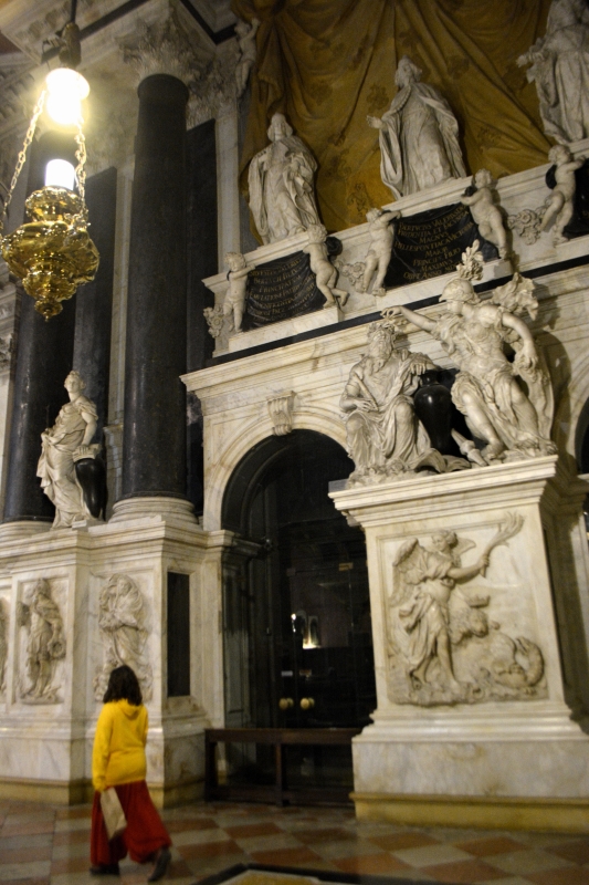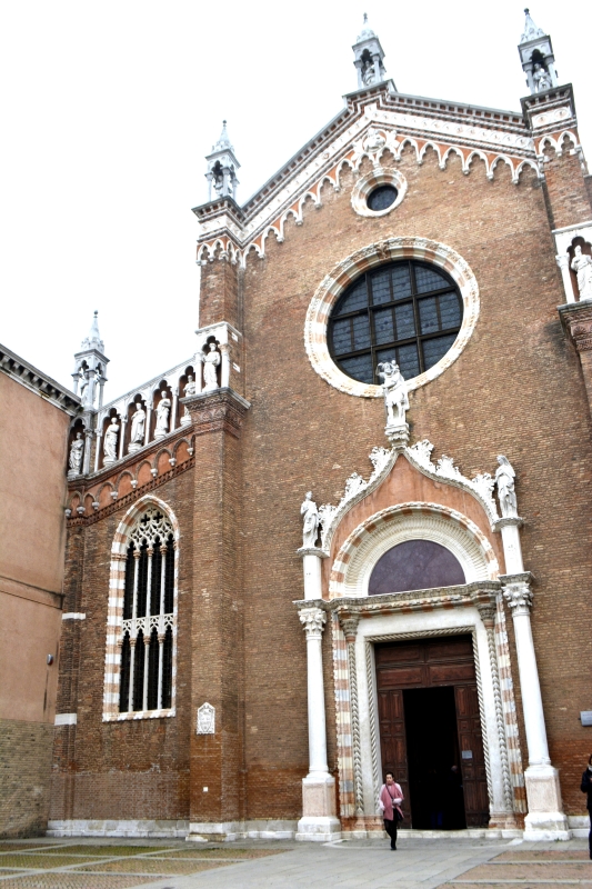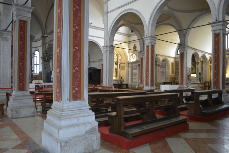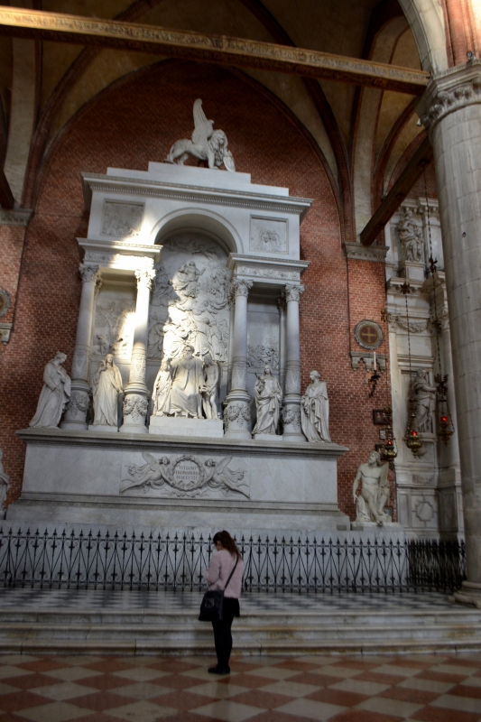 Bien entendu, nous n’avons pas manqué l’église Santa Maria dei Frari. Trois nefs, douze colonnes, tableaux du Titien, de Bellini, de Vivarini, de Veneziano (1339), 124 stalles décorées en bois marqueté et … les tombeaux des plus grandes figures de Venise, monuments funéraires ahurissants, presque monstrueux… Le Titien, Canova, le doge Pesaro, Monteverdi.
