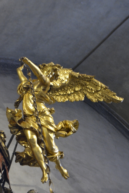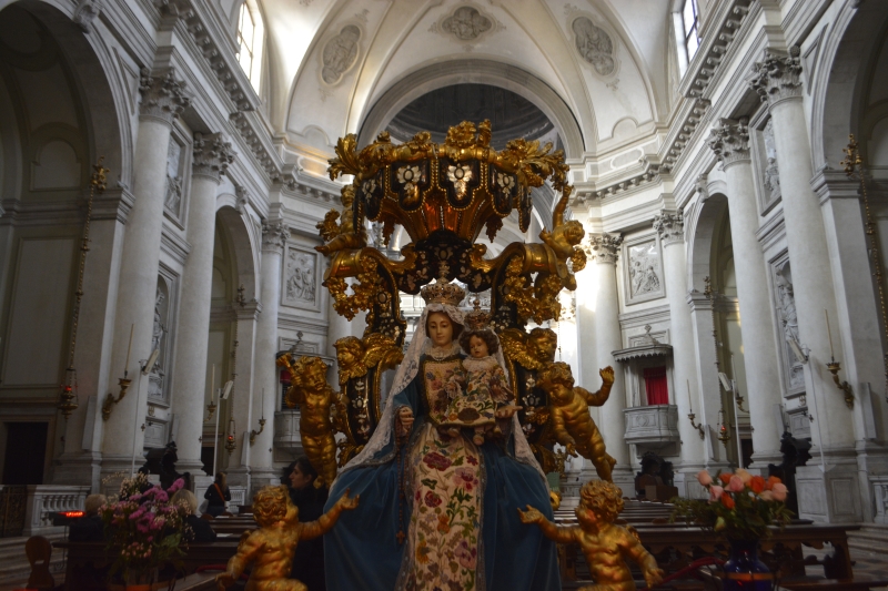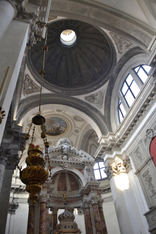 Sur les Zattere, nous avons eu le temps de faire le tour de l’église dei Gesuati ou Santa Maria de Rosario, avant de prendre le vaporetto. Où l’on apprend (si on ne le savait pas) que les soucis de comportement de l’Église ne datent pas d’aujourd’hui : l’emplacement de l’église avait été acheté par les Dominicains après que l’ordre des Gesuiti avait été dissous, au XVIIème, en raison de mœurs un peu légères. Là encore, tableau du Tintoret, plafond de Tiepolo, et bien sûr une madone au Rosaire toute en ors et fioritures rococos.