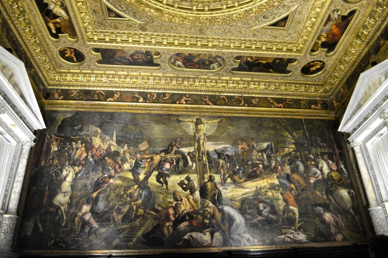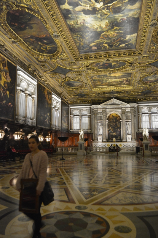 A côté de l’église dei Frari, la Scuola Grande di San Rocco. A ne pas manquer. Œuvres du Tintoret, mais un tableau du Titien et un de Tiepolo. La grande salle du premier, au plafond d’ors encadrant les tableaux du Tintoret, au sol comme souvent de marbres, et dont les murs sont recouverts de boiseries, sculptures représentant les vices et les vertus humaines (je n’ai pas compté qui des deux remportait le plus grand nombre de sculptures 😉 ). Dans la salle de l’Albergo, un des chefs d’œuvres du Tintoret, la Crucifixion.