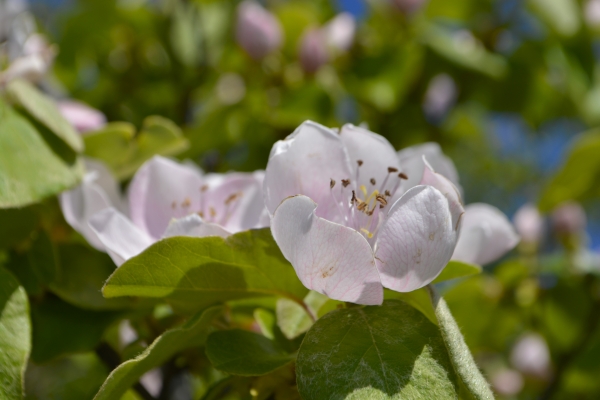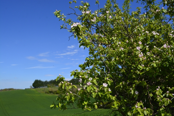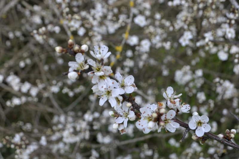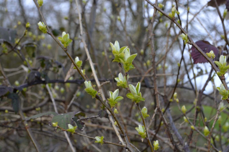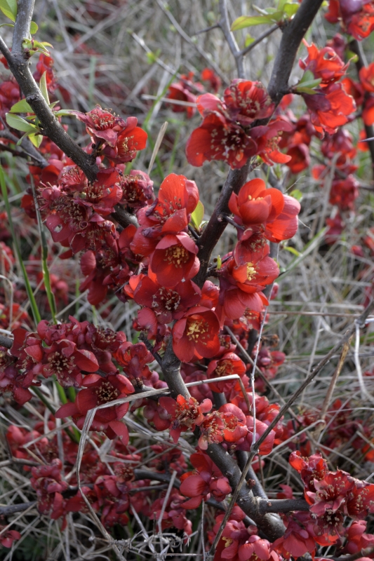 Les températures presque printanières, si on oublie le vent frisquet, ont réveillé les arbustes… bourgeons, jeunes feuilles, aubépines, ajoncs, ficaires, et toujours le si beau cognassier du Japon (aux fleurs bien plus belles que son nom…).