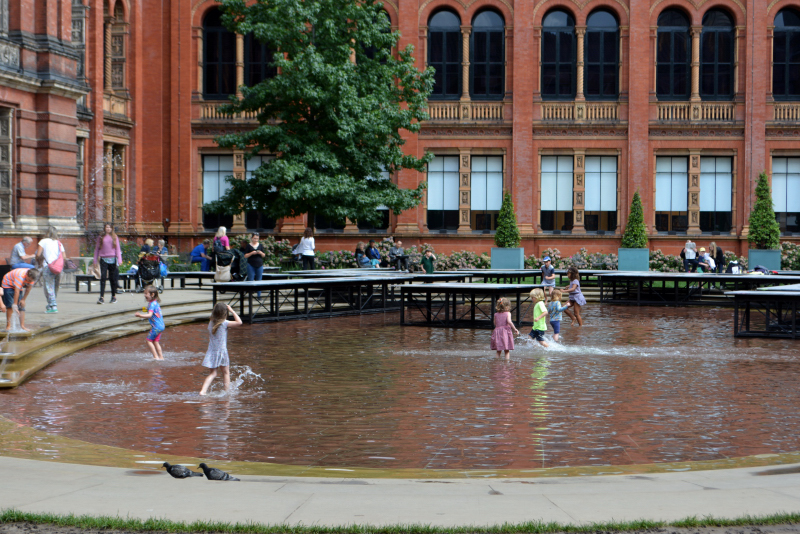 Peut-être qu’en reprenant l’ordre chronologique, je vais arriver à la fin de cette semaine londonienne ! Donc, après notre dimanche Royal, et notre visite du lundi matin autour de l’Histoire de Londres (voir : https://bbordasilvand.wordpress.com/2015/10/02/londres-2-musees/ ), nous voici partis en cette fin de matinée, sous une belle bruine, vers l’East End. Premier arrêt à Canary Wharf, dans l’île des chiens… un endroit où il ne faisait pas bon échouer au XIXème siècle… marécages, boues, cadavres entre deux eaux… les romans ne font pas dans la dentelle quand ils décrivent le lieu ! Enfin, entendons-nous, ils s’agissait du sud de cette Isle of Dogs. Car le nord était réservé aux bassins et entrepôts où débarquaient le rhum et le sucre des Antilles britanniques, donc moins sinistre. Aujourd’hui, inutile de trembler de peur et d’imaginer que vous allez vivre des aventures inquiétantes et étonnantes à votre arrivée sur les rives de la Tamise, à Canary Wharf. C’est une ville futuriste qui s’offre à vos yeux : immeubles en verre et acier, ou grandioses dans le style BCBG (anglais), places fleuries, fontaines, quais bordés de petits restaurants (plutôt chics)… quel dommage que la pluie soit de la partie, car au soleil, c’est certainement plus accueillant ! Mais ce jour-là, seul le métro apporte une touche de couleur dans une ambiance plutôt grise.