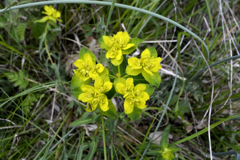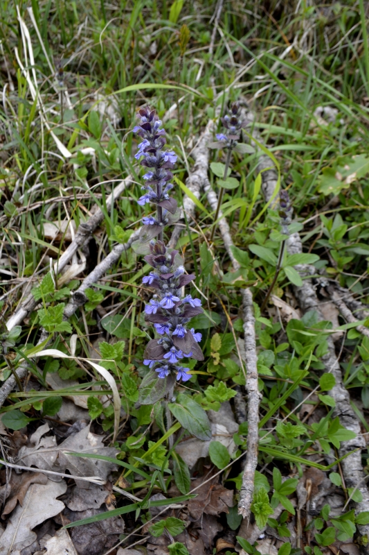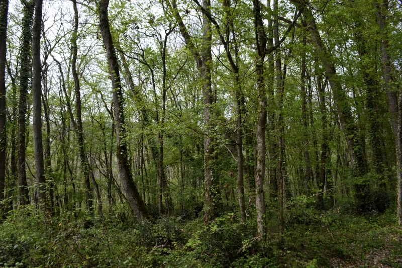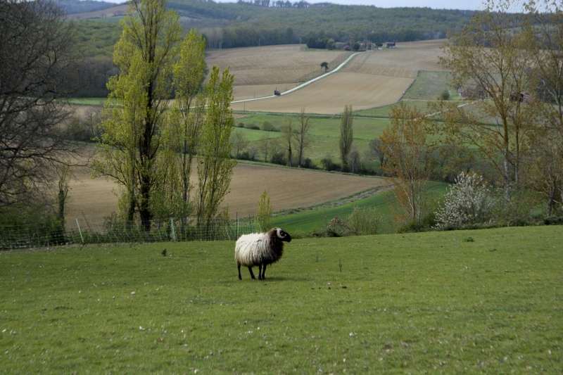 Mais je n’ai pas l’intention d’aller jusqu’à St Pé ou Drudas, je tourne en bordure d’un champ. Et je suis une sente, passage d’animaux certainement, avant de trouver un chemin plus large. Derrière moi les collines vers le Gers, à ma gauche le village de Galembrun, et tout en haut en face, la petite route que je vais prendre sur quelques mètres, avant de replonger dans le petit bois. Arbres emmêlés, genévrier, des champs bien vertes une fois arrivée sur la route. Et même, au fond, une vigne. Il en reste quelques unes, encore…
