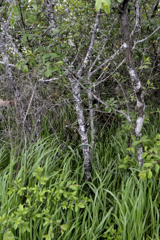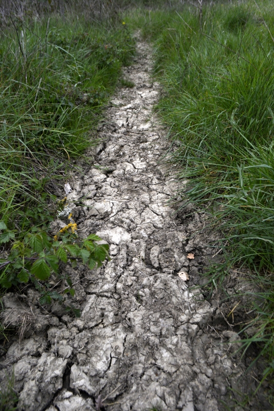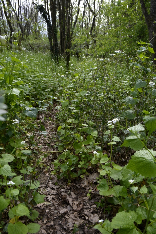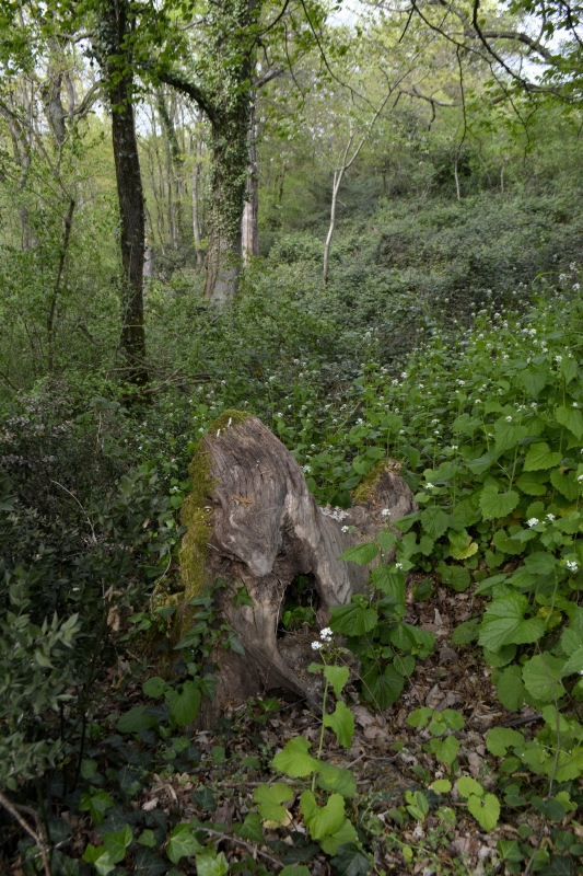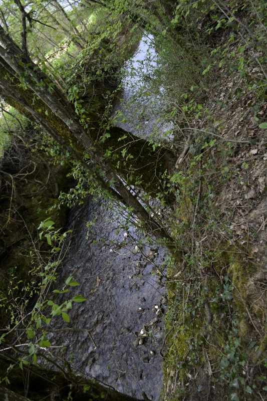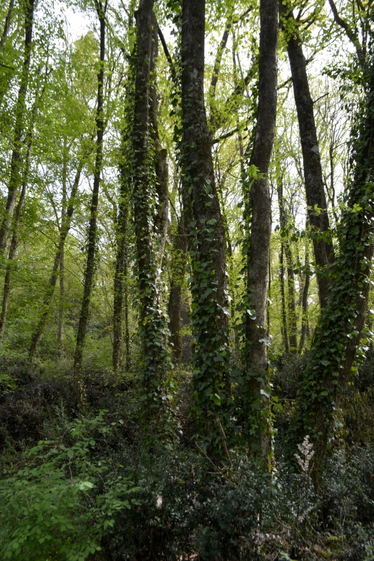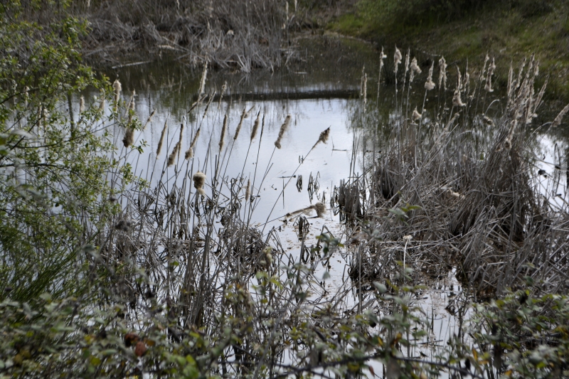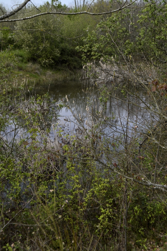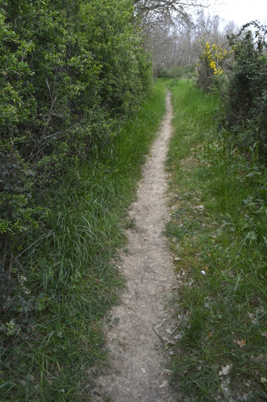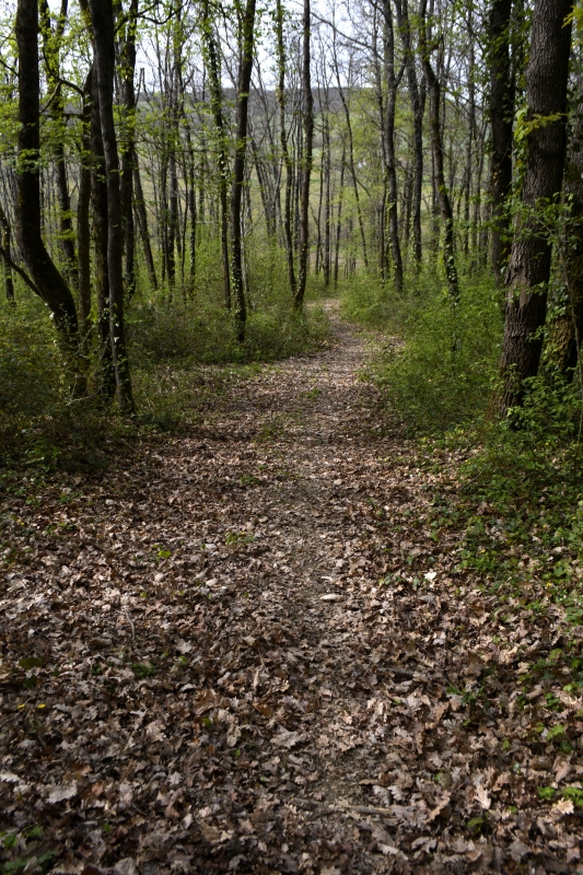 Mais voilà, impasse ! Zut, pas envie de faire demi-tour, je finis par trouver un petit fossé pas trop compliqué à passer, et me voilà sur le chemin connu, ouf ! Au bout, c’est le grand chemin installé sur l’ancienne voie de chemin de fer, avec ses tunnels d’arbres, ses bas-côtés verts par endroits (et où, au printemps, on trouve orchis et myosotis), son calme. En contrebas, tout un fouillis de branches, arbres, ronces…