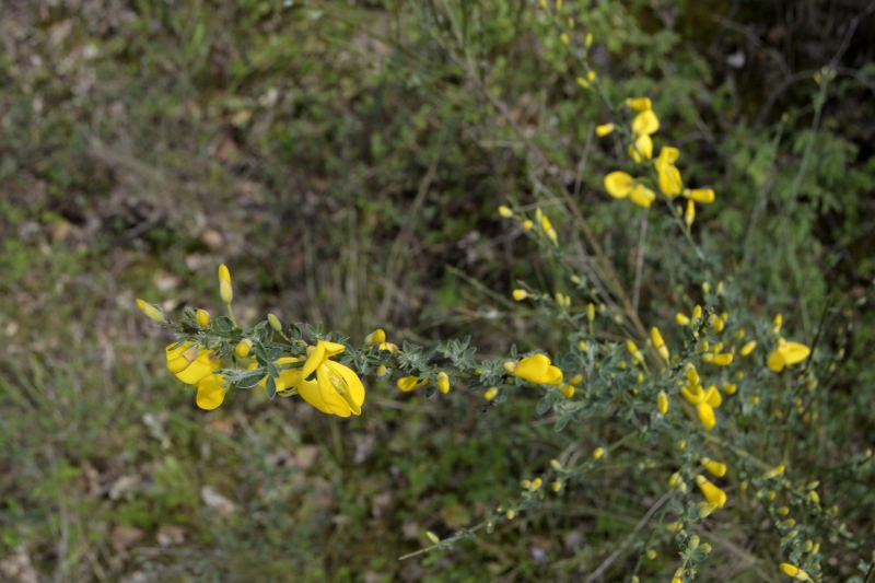 Beaux dessins géométriques dans le champ près du gué, et je reprends le chemin (balisé, qui va de Galembrun au Burgaud ou à Naples) pour le retour. Si jusque là c’était calme, la remontée cette fois se fait au son des motos-dites-vertes, car un petit terrain de cross est installé dans ce coin. Et en ce dimanche, de vacances scolaires en plus, il y avait quelques adeptes de ce truc-là….. mais bon, on le sait, et au moins avec tout ce bruit on est à peu près sûr de ne pas croiser un sanglier 😉 . Bref, je grimpe le chemin, et à la vieille palombière, je préfère revenir par celui qui longe les champs et le bois plutôt que retrouver la route. Les jonquilles ne sont pas encore ouvertes. Évidemment, presque à l’arrivée je m’arrête comme d’habitude pour admirer les coteaux. Et me voici à Galembrun.